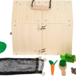 Plišasti zajček, lesen zajčnik (2 hišici), 2 žičnati ograji, metlica, skledica, lesena korenček, košček solate, filcani kakci