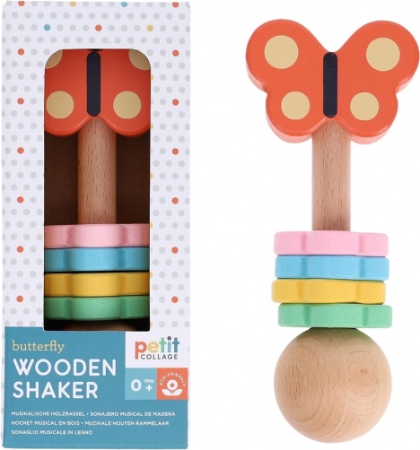 Nežna in barvita ropotuljica Metulj znamke Petit Collage je idealen spremljevalec za najmlajše. Pri nežnem stresanju oddaja prijetne zvoke, ki pomagajo pri razvoju slušnega zaznavanja in ritma.