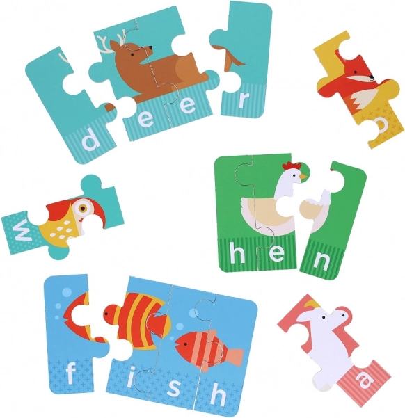 Vsaka sestavljanka povezuje prikupno sliko živali z angleško besedo s 3–4 črkami. Posebne oblike koščkov nakazujejo pravilno rešitev in podpirajo prvo črkovanje.