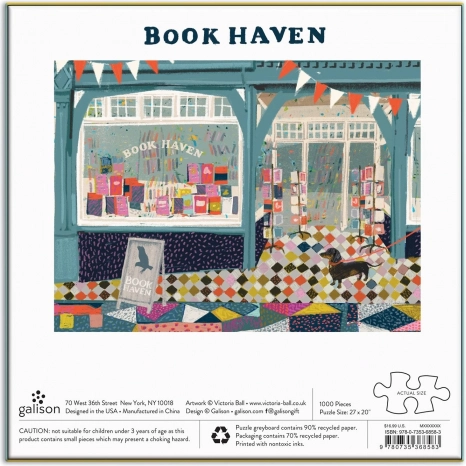 Potopite se v prijetno vzdušje knjigarne z motivom Book Haven avtorice VICTORIA BALL. Sestavljanka GALISON je zasnovana za sproščeno sestavljanje – mat površina zmanjšuje bleščanje, tiskarske barve so neškodljive, zadnja stran koščkov pa je gladka in prijetna na dotik. Odlična kot stilsko darilo za ljubitelje knjig in sestavljank.