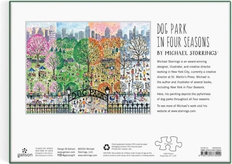 Uživajte v sprostitvi in izzivu z lepo izdelanim puzzlejem s 1000 koščki in ilustracijo mestnega pasjega parka v štirih letnih časih avtorja Michael Storrings. Kakovosten tisk z neškodljivimi barvami, mat zaključek za verne barve in podrobnosti ter čvrsta darilna škatla iz trajnostnih materialov naredijo ta puzzle idealno darilo in zbirateljski kos.
