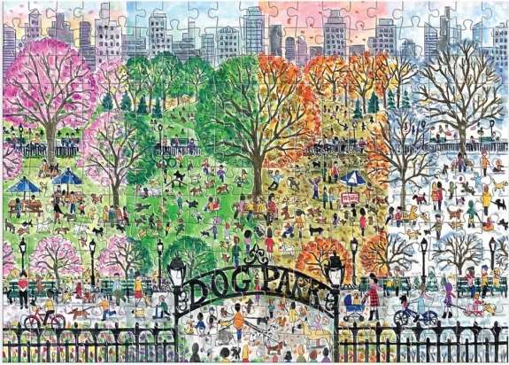 Izvirni motiv Pasjega parka v štirih letnih časih nagrajenega ilustratorja prinaša barve, detajle in veselje ob vsakem koščku.