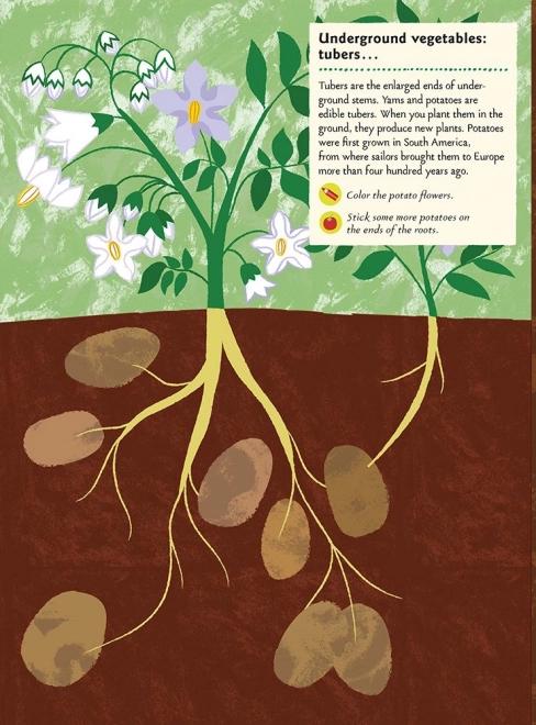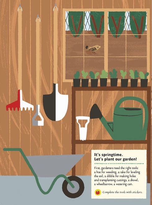Malčki vrtnarji se bodo naučili prepoznavati različne vrste zelenjave in sadja, izvedeli, kako jih pravilno saditi, zalivati in zanje skrbeti, ter katera orodja pri tem potrebujejo. Zahvaljujoč samolepkam in kvizu je učenje zabavno, motivacijsko in polno odkritij.