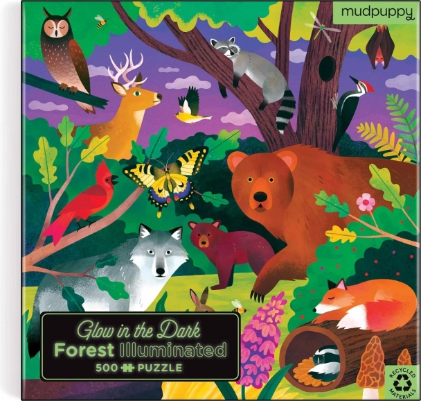 Sestavite čarobno gozdno sceno s sestavljanko MUDPUPPY s 500 kosi, ki po ugasnjenih lučeh sveti v temi. Kakovostna izdelava iz recikliranega papirja, natančen izsek in mat zaključek za verne barve in podrobnosti. Priložena sta referenčna slika in trpežna čvrsta škatla za enostavno shranjevanje. Ilustracije: Kaley McKean.