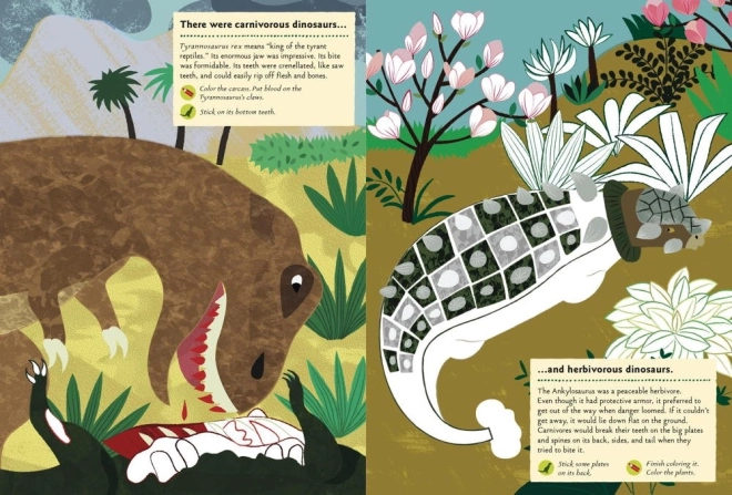 Vstopite z otroki v davno dobo dinozavrov. Ta skrbno ilustrirana knjiga aktivnosti ponuja pester nabor lepljenja, barvanja in dopolnjevanja, s katerim si mali raziskovalci razširijo znanje o najbolj znanih prazgodovinskih bitjih. Spoznali bodo, kaj so jedli, kako so lovili in kako so skrbeli za svoje mladiče.