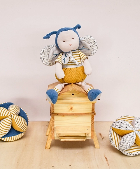 Tekstilna aktivna žoga Čebelica je popolna igrača za malčke. Njena mehka tekstura pritegne otroke in spodbuja taktilno stimulacijo ter lahek oprijem. Žogica vsebuje vgrajeno ropotuljico, ki pritegne pozornost in prispeva k razvoju sluha.