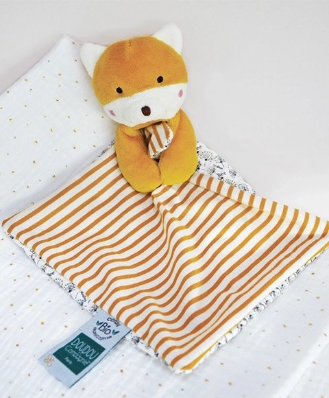Ta mehka lisica z ninico je zasnovana v harmoničnih, z naravo navdihnjenih barvah, da dojenčku prinese občutek miru in varnosti. Organski materiali, prijazni do kože, podpirajo razvoj čutov, medtem ko nežna tekstura pomirja ter spremlja malčka pri spanju in počitku.