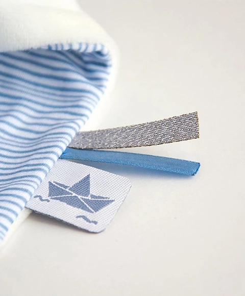 Odkrijte čar Zajčka Mornarja, ki je dobavljen v prekrasni darilni škatli, ki vzbuja občutek sodobnosti in prestiža. Ta ljubki zajček je oblečen v modro-belo črtasto majico in krasi ga majhna krona. V roki drži odejico, ki služi kot ninica, enostavna za prijem malih ročic vašega otroka.