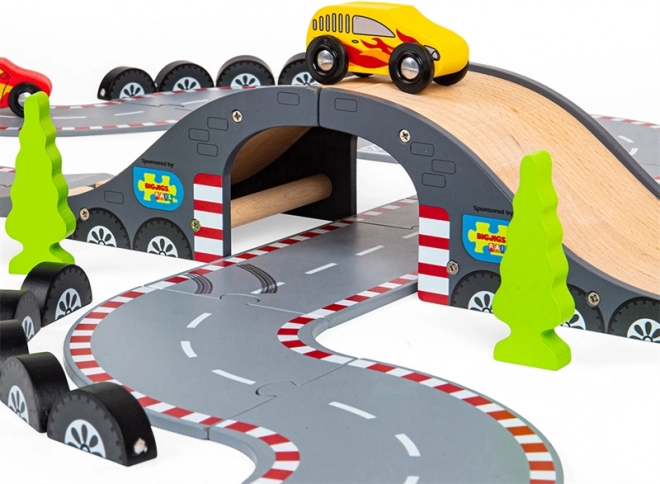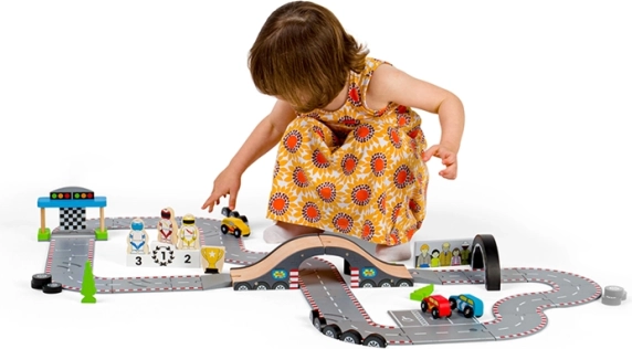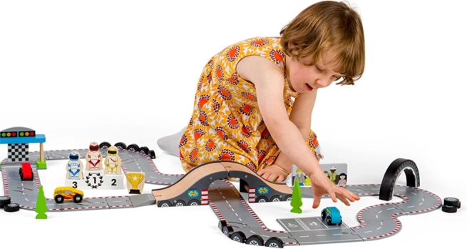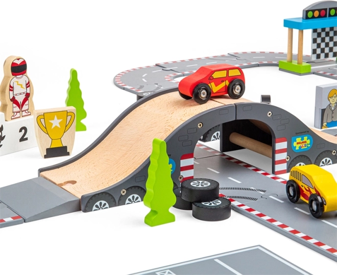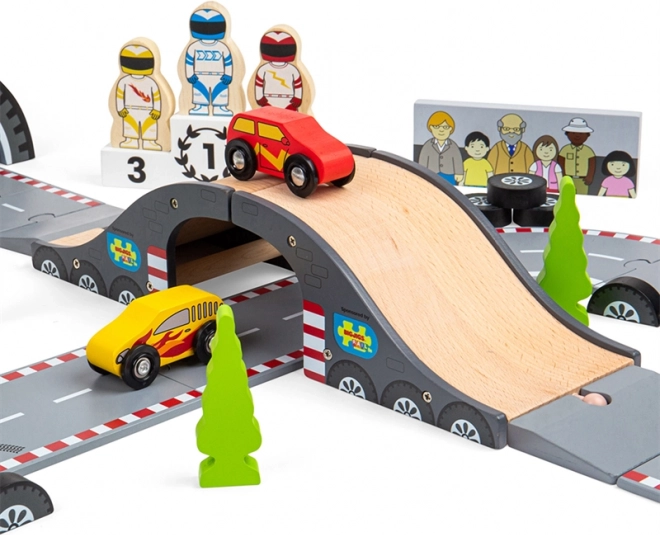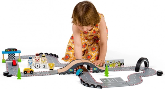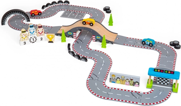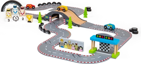 Odkrijte lepoto klasičnega dirkanja s to čudovito leseno dirkalno stezo od Bigjigs Rail. Steza vključuje: