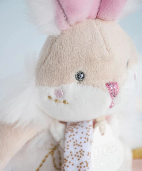 Ta mehki zajček združuje kar tri funkcije v enem: ljubko crkljivo igračko, nežno ropotuljico za razvoj sluha in držalo za dudo, zahvaljujoč kateremu bo duda vedno pri roki. Premium mehek pliš zagotavlja prijeten dotik in varno crkljanje že od prvih dni življenja.