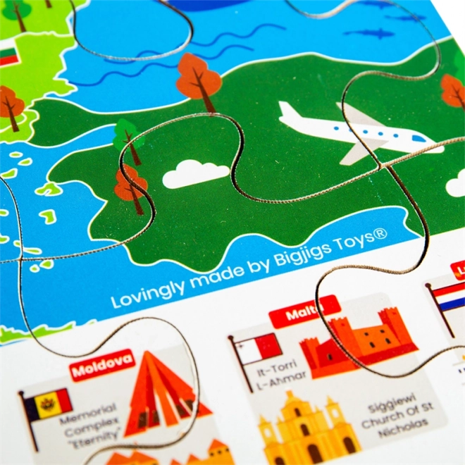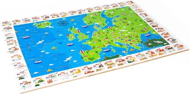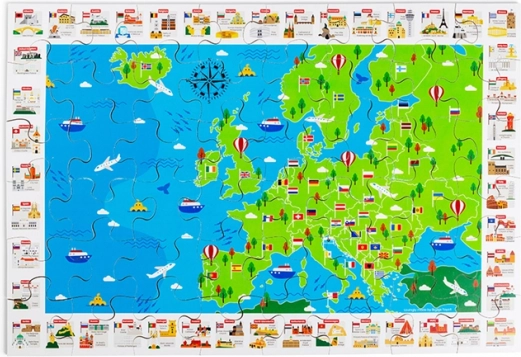 Barvit zemljevid Evrope z zastavami in ikoničnimi znamenitostmi motivira otroke k odkrivanju držav in njihove lege. Sestavljanje razvija logiko, orientacijo in besedni zaklad.