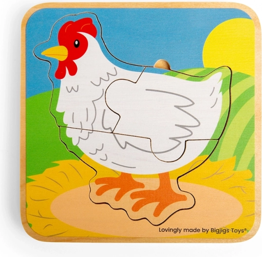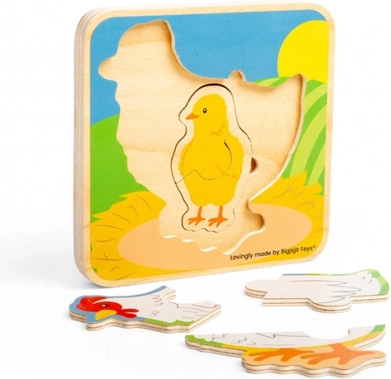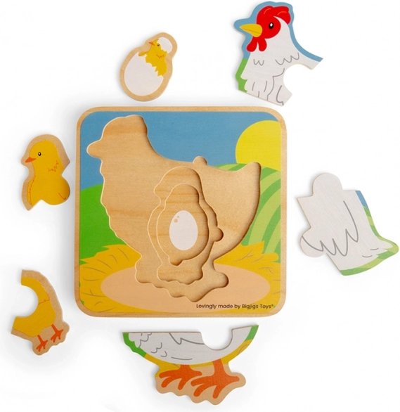 Te kompaktne lesene puzzle z motivom kokoši otroke popeljejo skozi štiri faze razvoja – od jajca, prek piščančka do odraslosti. Deli se zlagajo postopoma po velikosti, kar podpira razumevanje zaporedja ter naravno razvija potrpežljivost in zbranost.