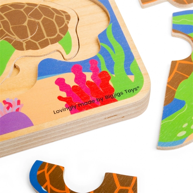 Ta lepo ilustrirana lesena sestavljanka otrokom nazorno pokaže, kako želva raste – od jajčeca, preko mladiča, do odrasle želve. Posamezne koščke se vstavljajo po velikosti, otroci pa tako korak za korakom odkrivajo naslednjo fazo razvoja.