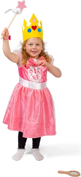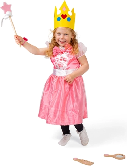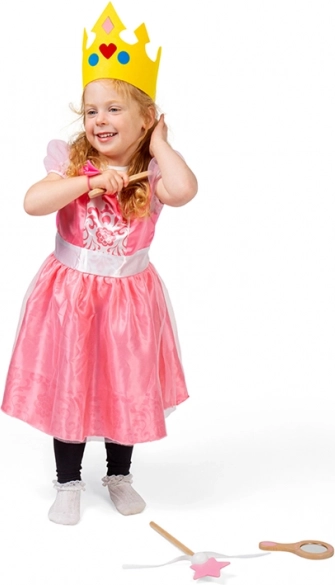 Spremenite vsako igro v kraljevsko pustolovščino s tem čarobnim kompletom za male princese. Rožnato obleko z nežnimi detajli in mrežastimi rokavi dopolnjuje krona, ogledalce, glavnik in čarobna paličica. Komplet spodbuja ustvarjalnost, igro vlog in razvoj domišljije. Testirano po standardih EN71 in REACH.