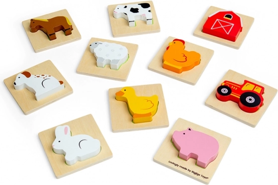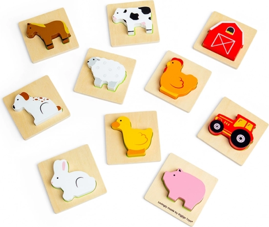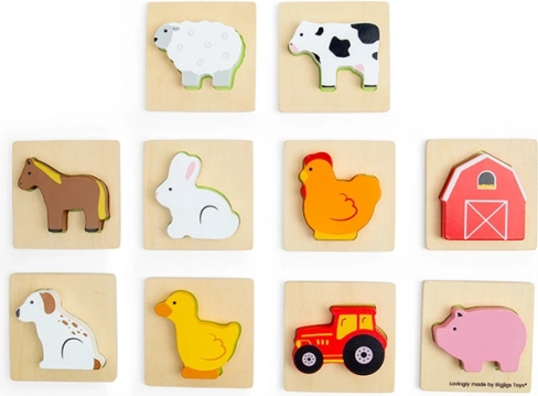 Set vsebuje 8 priljubljenih domačih živali in 2 kmečka motiva (traktor in skedenj). Deli so čvrsti, barviti in prijetni za držanje. Zahvaljujoč kompaktni tekstilni vrečki je igra popolna za potovanja, restavracijo ali obisk pri starih starših.