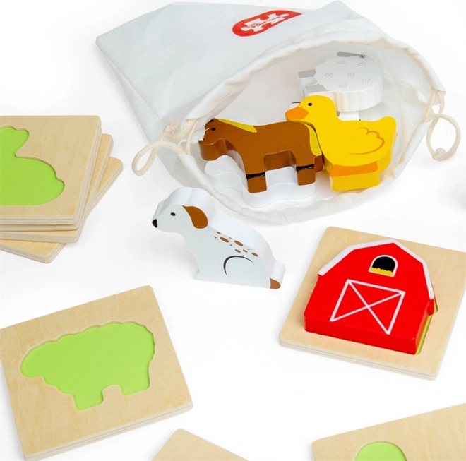 Ta potovalna igra na temo kmetije prinaša otrokom veselje do odkrivanja. Roko položijo v tekstilno vrečko in z otipom iščejo košček, ki se prilega ustrezni leseni podlagi. Zabava, ki nevsiljivo podpira osredotočenost, koordinacijo oko–roka ter besedni zaklad pri poimenovanju živali in predmetov s kmetije.