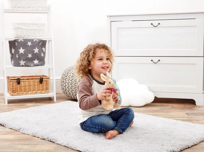 Plišasti zajček Flopsy je izdelan iz visokokakovostnih in najmehkejših tkanin, ki so prijetne na dotik in nežne do otroške kože. Prijazen izraz, dolga ušeska in kontrastna mašn’ca ga naredijo za priljubljenega spremljevalca za spanje in potovanja.