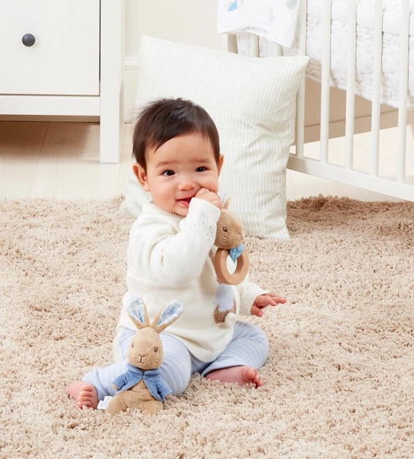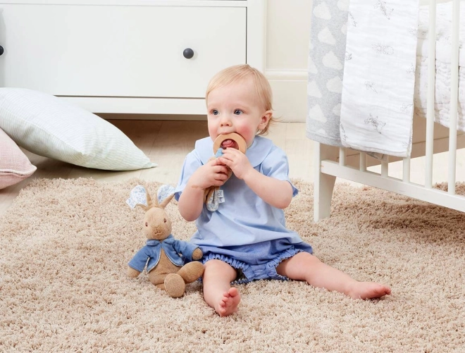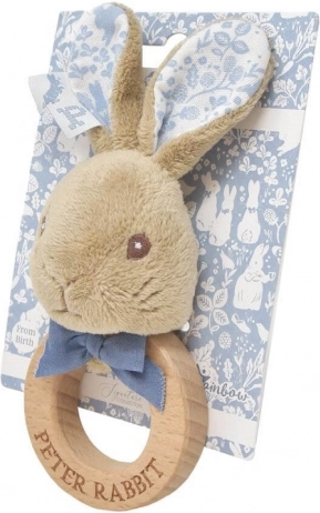 Ta stilska ropotuljica in grizalo z zajčkom Peter Rabbit podpirata zgodnji razvoj dojenčka z bogato senzorično stimulacijo. Združujeta mehak, prijeten pliš iz 100% bombaža in čvrst lesen obroč iz trajnostnih virov, ki ga zlahka držijo tudi majhne otroške ročice.
