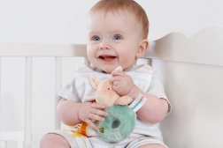 Ta igrača je opremljena z nežno ropotuljico, ki podpira razvoj otrokovih čutil in stimulacijo prek zvoka in dotika.