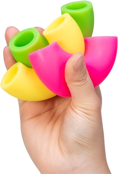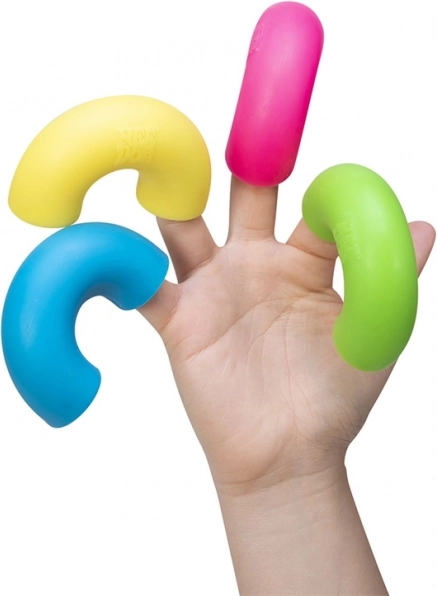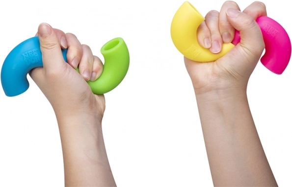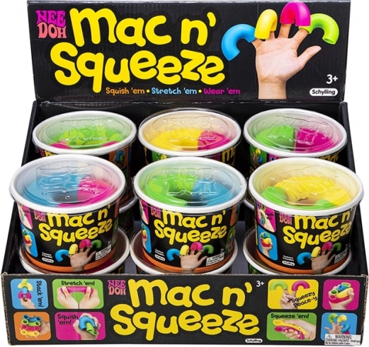 Zabavni antistresni makaroni NEE DOH MAC N' SQUEEZE prinašajo štiri neonske cevčice, ki jih lahko stiskaš, razteguješ, upogibaš in natakneš na prste. Zahvaljujoč mehkem otipnemu materialu nudijo hitro sprostitev napetosti in senzorično stimulacijo, s praktičnim lončkom pa so idealni za na pot.