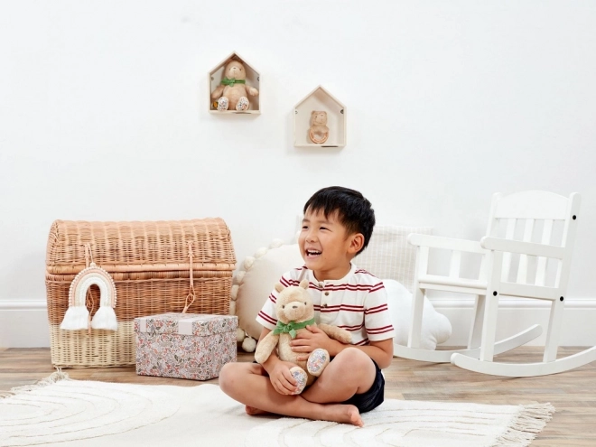 Ljubki plišasti Medvedek Pu velikosti 25 cm je izdelan iz izjemno mehkih in trajnostnih materialov, z recikliranim polnilom za varno in nežno crkljanje. Stilski zeleni trak ter cvetlični detajli na tačkah dodajo igrački poseben čar. Odličen kot darilo za novorojenčka, priložena je darilna škatla s prostorom za posvetilo.
