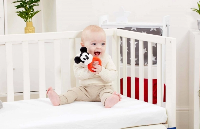 Plišasta ropotuljica MICKEY MOUSE v priljubljeni črno‑belo‑rdeči izvedbi je odličen spremljevalec za prvo raziskovanje sveta. Mehki materiali so prijetni na dotik, diskretno ropotanje pa motivira otroka k gibanju, tresenju in raziskovanju.