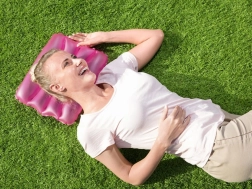 Vzglavnik je opremljen z varnostnim ventilom, ki preprečuje samodejno uhajanje zraka. Ergonomsko rebrast zgornji del povečuje udobje pri ležanju in sedenju. Podnevi služí kot mehka podlaga, ponoči kot praktičen vzglavnik za spanje – brez potrebe po tlačilki.