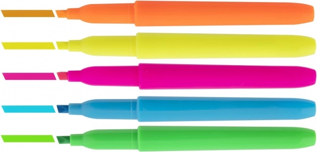Del paketa je pet izrazitih barv (oranžna, rumena, roza, modra, zelena) s široko konico za tekoče in intenzivno barvanje.