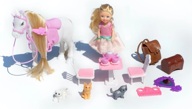 Ta prikupen igralni set združuje priljubljene elemente – punčko, konjička in mucke – skupaj s praktičnim pohištvom in dodatki. Otroci lahko ustvarjajo lastne zgodbe, skrbijo za živalice ter pripravijo piknik ali čajanko pri mizici.