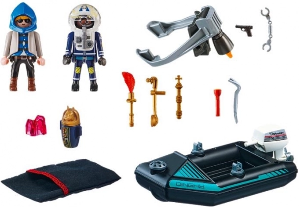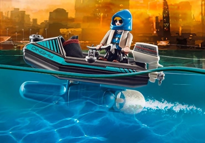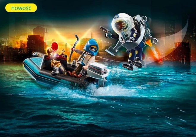 Vse je pripravljeno na akcijo v Playmobil City Action. Policist z reaktivnim nahrbtnikom se hitro približuje tatu, ki na čolnu beži z ukradenimi umetninami. Zahvaljujoč svoji iznajdljivosti in opremi častnik storilca hitro obvlada in vrne dragocene predmete v muzej.