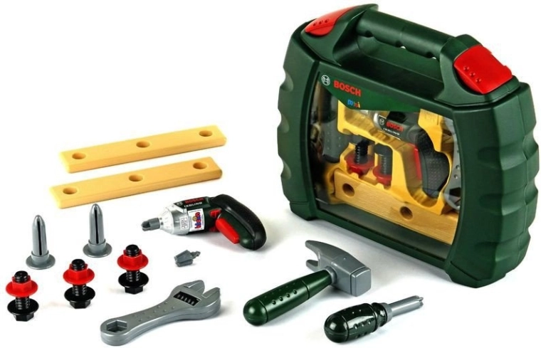 Vsebuje izvijač, ključ, kladivo, vijake, žeblje in montažne letvice – vse zasnovano za varno in zabavno igro od 3. leta dalje.