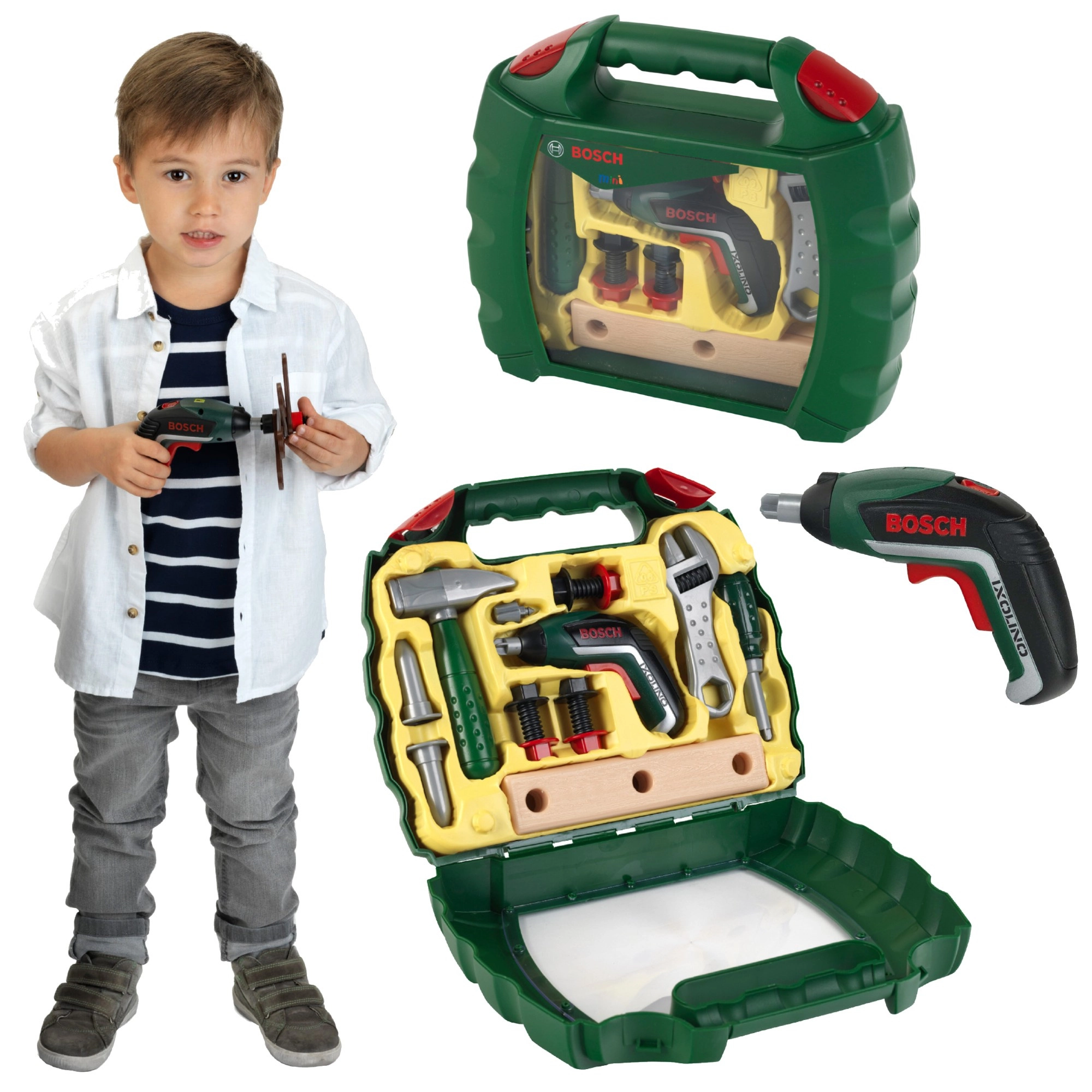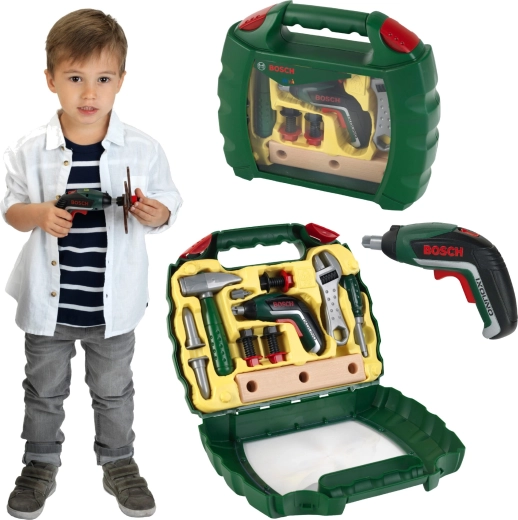 Praktičen otroški kovček z orodjem iz licenčne linije BOSCH Mini znamke Klein bo razveselil vsakega malega mojstra. Vsebuje funkcionalni igrači akumulatorski vijačnik Ixolino II z izmenljivimi nastavki, načinom desni/levi tek in zvokom motorja, dopolnjen z kladivom, izvijačem, francoskim ključem, vijaki, maticami in »lesenimi« deli. Trden temno zelen kovček s prozornim pokrovom in dvojno rdečo zaponko vse varno drži skupaj.