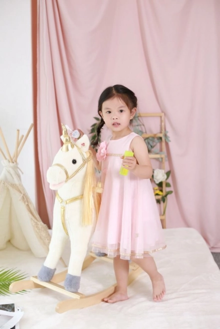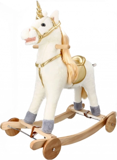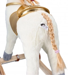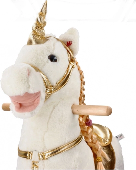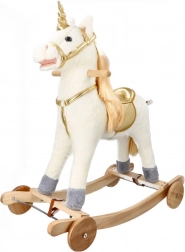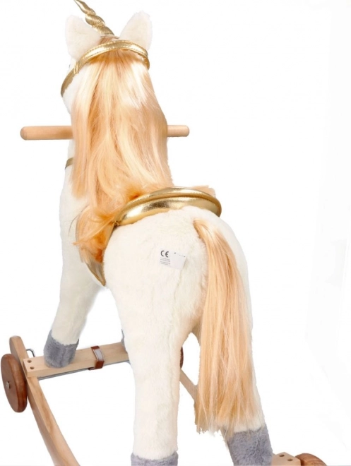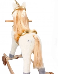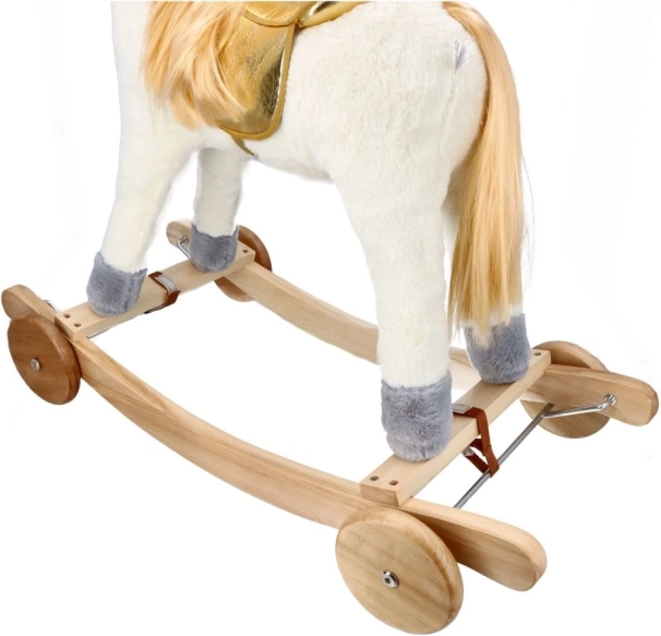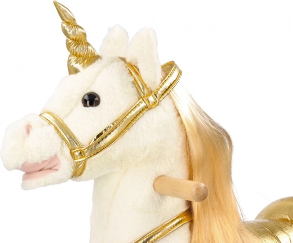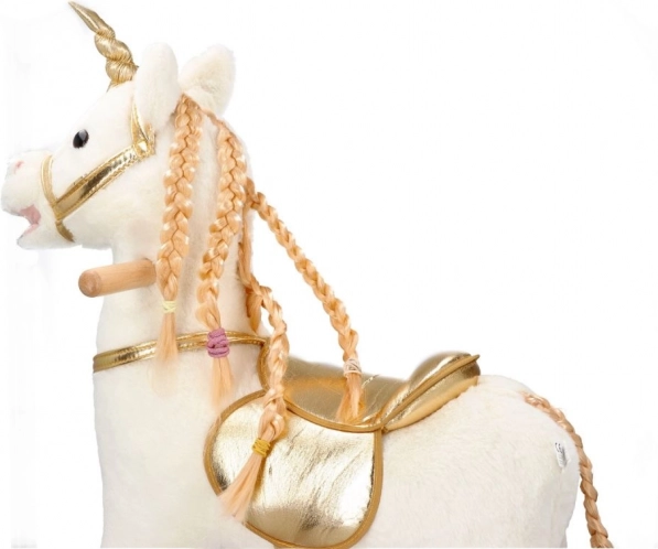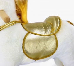Odkrijte vznemirjenje vožnje na tem čudovitem zlatem samorogu. Z mehkim in prijetnim plišem ponuja udobne in zabavne trenutke za vaše otroke. Stabilna lesena konstrukcija in elegantni pozlačeni detajli pričarajo čarobno vzdušje vsake igre.