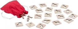 Tipalna igra spomin Ključi je izvirna opazovalna in senzorična aktivnost, ki podpira zbranost, koordinacijo oko–roka ter razlikovanje drobnih razlik. Igralci iz vrečke vlečejo ključe in čim hitreje poskušajo najti ustrezno šablono na leseni ploščici – pravilna izbira pomeni točko.