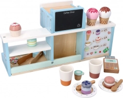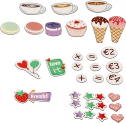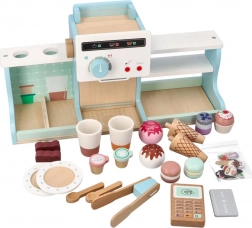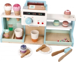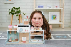 Ta lesena sladoledarna in kavarna ponuja otrokom pristno izkušnjo strežbe malega bistroja. Z barvitimi dodatki, vrtljivimi gumbi in realističnimi elementi kavnega aparata ter stojnice za sladoled otroci razvijajo fino motoriko, komunikacijo in domišljijo.