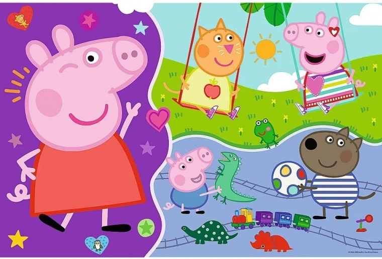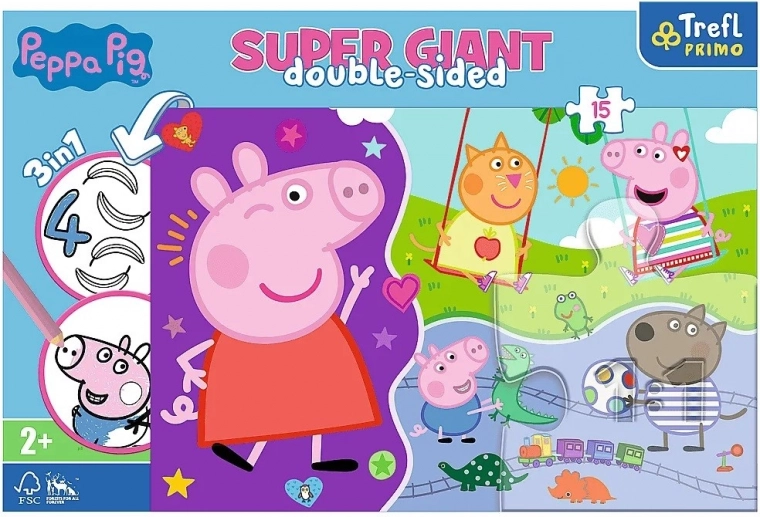 Ta velikanska sestavljanka z motivom Pujsice Pepe prinaša otrokom trojno mero zabave. Veliki, trdni kosi so preprosti za prijem z malimi rokami, preprosta barvita grafika z velikimi liki pa motivira k ponovnemu sestavljanju. Na hrbtni strani se skriva še pobarvanka in preprosta igra z barvanjem, zato otroci vadijo barve, koncentracijo in domišljijo.