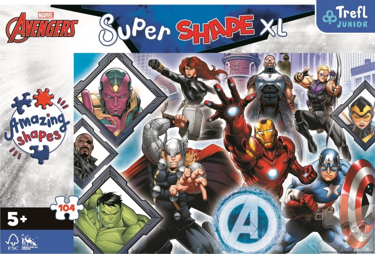 Odkrij zabavne otroške puzzle s heroji AVENGERS! Set XL Super Shape vsebuje 104 kosov z različnimi oblikami, ki spodbujajo razvoj otrok in zagotavljajo dolgotrajno ter ustvarjalno zabavo. Po sestavi nastane slika dimenzij 600 × 400 mm, idealna za otroke od 5 let.