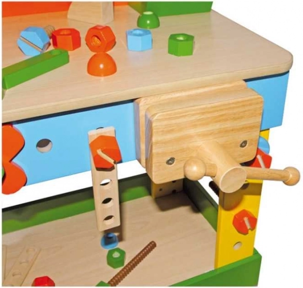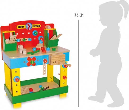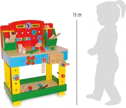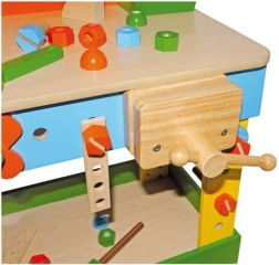 Ta stabilna in varna otroška delovna miza iz kombinacije masivnega bukovega lesa in trpežne vezane plošče ponuja realistično okolje za prve mojstrske projekte. Otroci na zabaven način spoznavajo orodja, materiale in osnovne delovne postopke, hkrati pa razvijajo koordinacijo oko–roka in potrpežljivost.