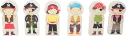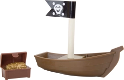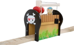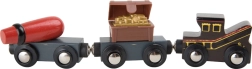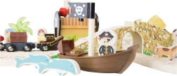 Vstopite v svet piratov in domišljije. Šest piratov gospodari svoji železnici na otoku, kjer lesene tirnice vodijo preko mostu z zvoncem, vlak pa prevaža top in skrinjo, polno zlata. Postaja z žerjavom in magnetno kljuko omogoča enostavno nakladanje tovora – le zavrtite mehanizem in spustite magnet navzdol.