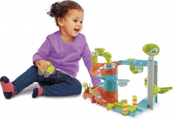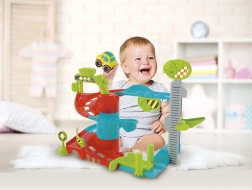 Avtomobilček se med spuščanjem po stezi zabavno preobrača in dela salte, s čimer spodbuja otroško radovednost in veselje do odkrivanja.