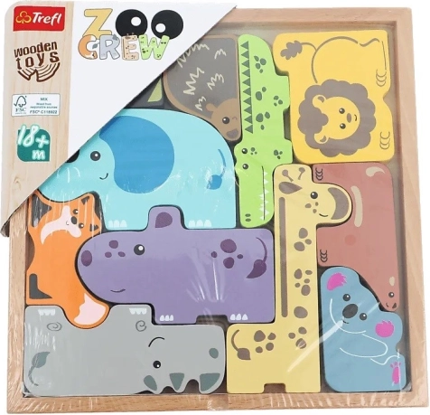 Vesela lesena miselna sestavljanka iz kolekcije ZOO CREW znamke TREFL bo razveselila male in velike. Vsebuje 11 koščkov v obliki živalic, ki jih otroci nameščajo po obrisih v škatlico. Igra razvija motoriko, logiko in prostorsko predstavljivost in je primerna že od 18 mesecev.