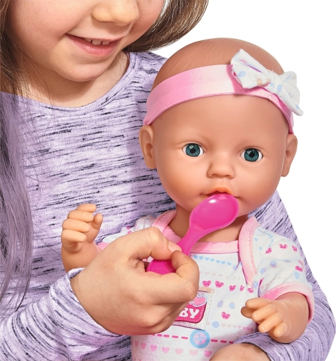 Ta funkcijska punčka v ljubkem rožnato-belo oblačilu je idealna spremljevalka za vsakodnevno igro nege dojenčka. Otroci lahko punčko hranijo, napajajo, ji dajo dudico, zamenjajo plenico in jo posadijo na kahlico. Realistične podrobnosti in premične veke spodbujajo domišljijo in fino motoriko.