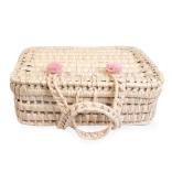 Ta ročno tkan kovček iz posušenih palmnih listov je lep, lahek in hkrati trpežen. Zahvaljujoč tekstilnim predalčkom ohranja vse pregledno na svojem mestu, otroci pa ga lahko zlahka vzamejo s seboj kamorkoli. Naravni material in skrbna izdelava ga naredita za trajnostno in modno izbiro za otroško igro.