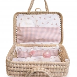 Del kompleta je osnovna nega za punčko – steklenička, dudica in plenička za enkratno uporabo. Kovček je zaradi univerzalne zasnove primeren tudi kot piknik košarica. Vzdrževanje je enostavno: ob umazaniji ga preprosto obrišite z vlažno krpo in takoj osušite.