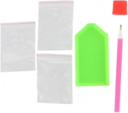 V paketu najdete vse, kar potrebujete: platno z natisnjeno sliko in lepilno plastjo, aplikacijsko pero, vosek, posodico in komplet barvnih kamenčkov. Folijo na platnu odstranjujte postopoma, kamenčke pa s pomočjo peresa z voskom natančno prenesite na označena mesta. Končano sliko lahko preprosto uokvirite in razstavite (okvir ni del paketa).
