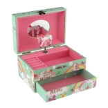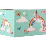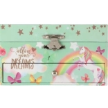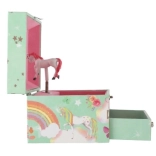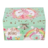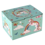 Čarobna glasbena škatlica za nakit z motivom enoroga v pastelno zeleni barvi bo navdušila vsako malo damo. Po navijanju ključka se v notranjosti zavrti figurica enoroga in zazveni nežna melodija. V notranjosti najdete ogledalce, pregledne predalčke in praktičen predal za drobne zaklade. Odporna kartonska konstrukcija, kovinski elementi ter očarljive ilustracije mavrice, zvezdic in metuljev lepo popestrijo otroško sobo.