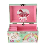 Ta stilska glasbena škatlica za nakit z enorogom je idealna za shranjevanje prstanov, uhanov in drobnih skrivnosti. Po odprtju pokrova z ogledalcem se po navijanju ključka zavrti belo-rožnati enorog in zazveni nežna glasba. Notranjost ponuja razdeljen prostor za nakit, spodnji predal pa sprejme dodatne dragocenosti.