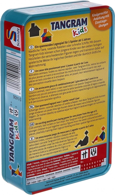Odkrijte klasično logično igro za male in velike – barvni tangram za otroke znamke Schmidt v priročni kovinski škatlici. Iz 7 lesenih koščkov boste sestavili desetine likov, živali in predmetov ter pri tem urili logiko, prostorsko predstavo in ustvarjalnost. Priloženih je 50 predlog s 3 stopnjami težavnosti in rešitvami. Idealno za na pot ali domov, priporočeno od 5 let.