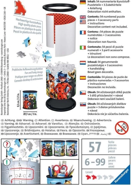 Odkrijte čar 3D sestavljank Ravensburger, ki jih je zaradi posebnih ukrivljenih koščkov enostavno sestaviti. Ti zagotavljajo stabilno konstrukcijo brez potrebe po lepilu. Po sestavi stojalo služi ne le kot prostor za svinčnike, temveč tudi kot shranjevalni prostor za kozmetiko ali druge drobnosti v otroški sobi.