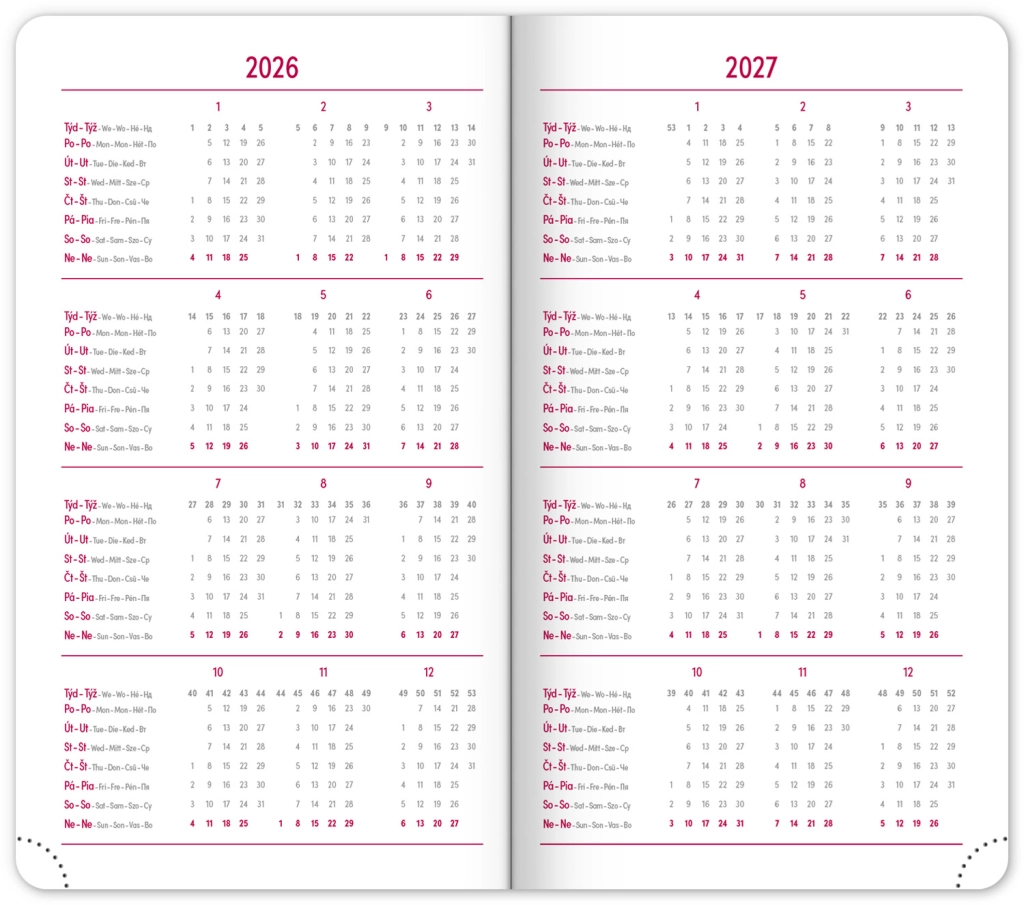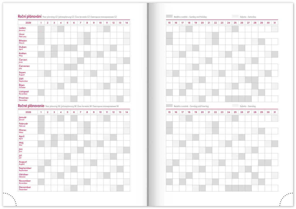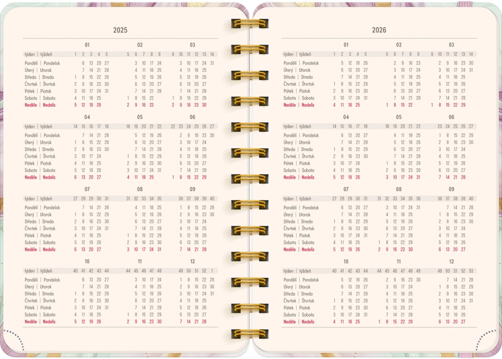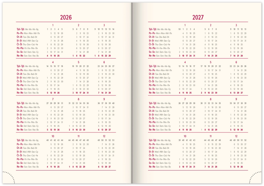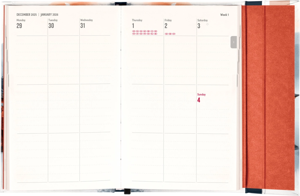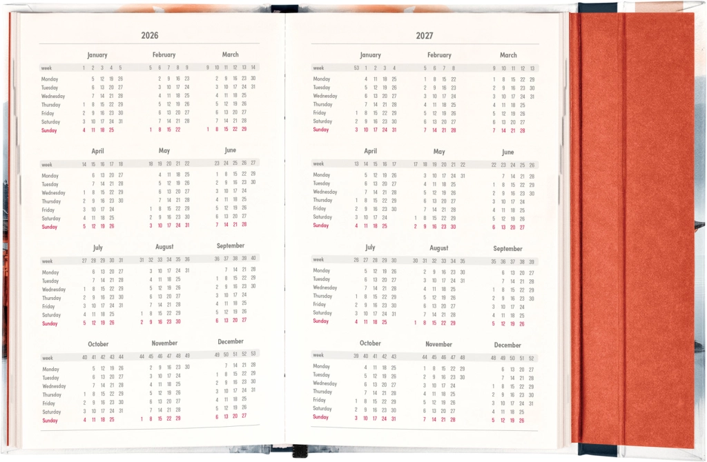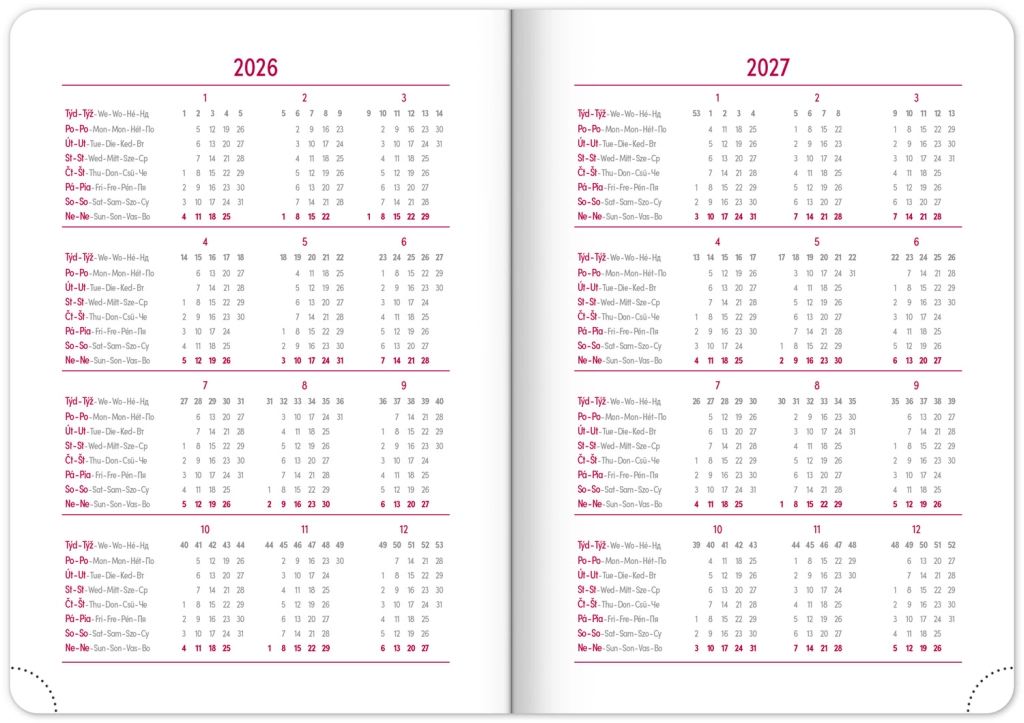 Premišljena notranja razdelitev ponuja mesečne preglede, to‑do sezname, cilje, stike in strani za zapiske. Izberite spiralno (krožno) vezavo za lahko obračanje ali trdo šivano vezavo z elastiko, držalom za pisalo, žepkom za malenkosti in perforiranimi vogali za hitro orientacijo. Kakovosten papir z višjo gramatura omejuje prepisovanje, odporne trde ali mehke platnice pa izstopajo tako v nahrbtniku kot na delovni mizi. Potrebujete šolski dnevnik za semester, delovni dnevnik za pisarno ali univerzalni planer brez datumov? Izberite razporeditev, ki vam ustreza: pregleden teden na dveh straneh za hitro planiranje, podroben dnevni razpored za veliko nalog ali kombinacijo z mesečnim koledarjem. Zaradi pametne razdelitve, motivacijskih elementov in jasne strukture boste organizirani, učinkoviti in mirni vsak dan.